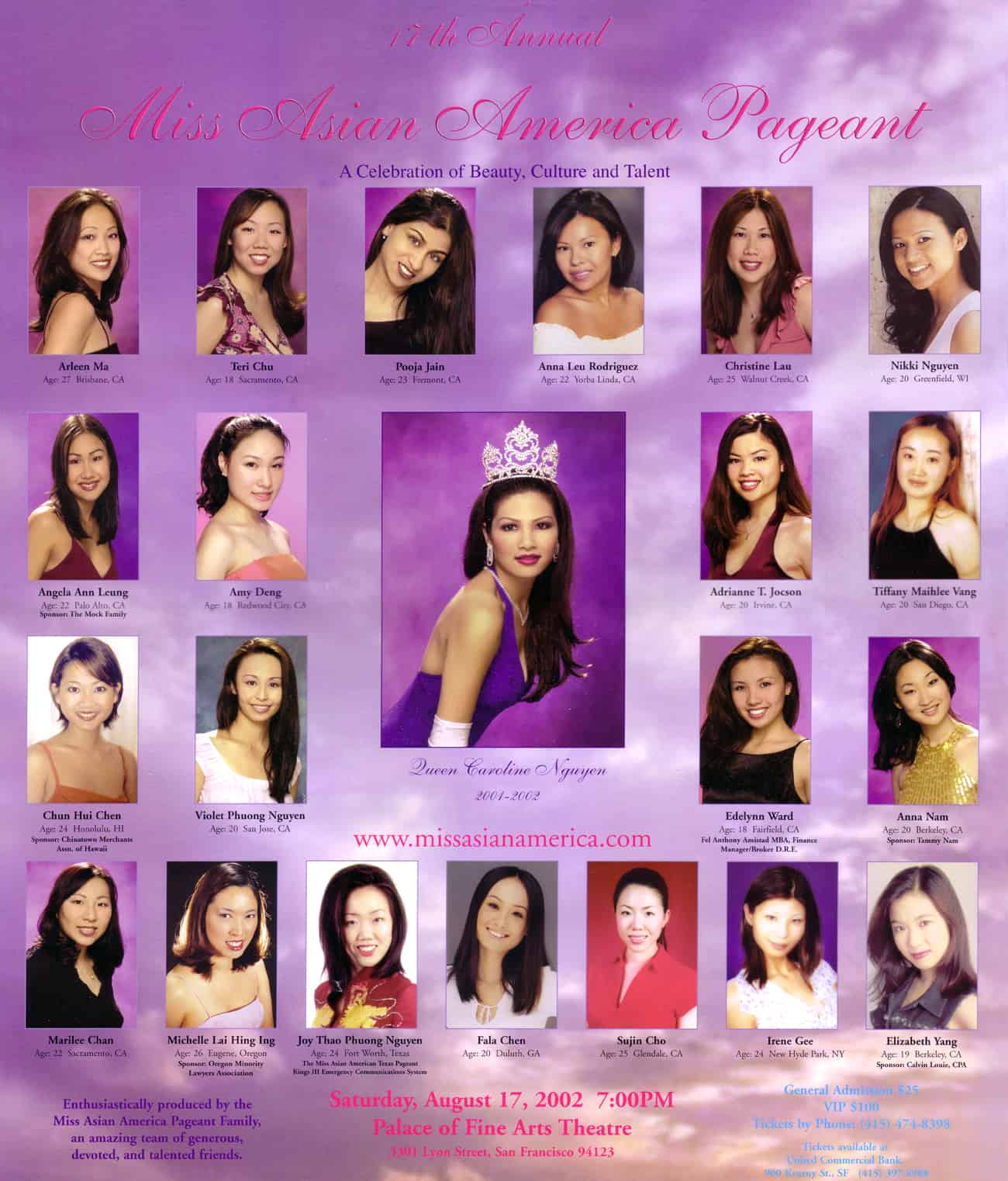 San Francisco, CA — August 17, 2002 — The 17th Annual Miss Asian America Pageant, a celebration of Asian beauty, culture and talent, took center stage at the Palace of Fine Arts in San Francisco. The pageant was a remarkable display of grace and cultural pride as 19 accomplished young women competed for the coveted title. Fala Chen was crowned Miss Asian America and also received the honor of Miss Community Service. Fala’s dedication to her community and her exceptional accomplishments set a shining example for future generations.